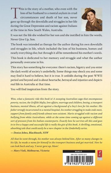 This is the story of a mother, who even with the loss of her husband to a mental asylum in cruel circumstances and death of her son, never gave up through the downfalls and struggles in her life during the Great Depression and racism against Italians at the time in New South Wales, Australia. It was not the life she wished for her son and she instilled in him the words, Never Give Up, Son. The book was intended as therapy for the author during his own downfalls and struggles in life, which included the loss of his business, homes and nearly everything else; but through it all he remembered his mother's words. This book is dedicated to her memory and struggle and what the author personally overcame in his. This story has something for everyone: there's racism, bigotry and you enter the dark world of society's underbelly. Some things may shock you and some may find it hard to believe, but it is true. It unfolds during the post WWII period and beyond and is about heartache, betrayal and injustice and depicts real life in Australia at that time. You will find inspiration from the story.