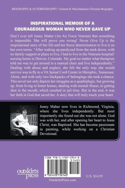 A Compelling Memoir Sure to Touch Your Heart. Jenny shares with you her story, where she was forced to grow up much too early. Growing up in Los Angelos, she was in the system most of her life. Her mom's mental illness would sometimes cause her to be hospitalized, and with no other relatives close by, Jenny and her older brother had no choice but to be placed in separate foster homes. She not only had to deal with abuse growing up, she never experienced the comfort of hearing the words "I Love You," getting tucked in at night, or feeling her mom's arms wrapped around her so tight that she could finally feel safe. It was a life she tried to keep hidden from her friends. Until the day of her 18th birthday, (April 15th) her mom had sent her to live with one of her high school friends. She was a year younger then Jenny. They only knew each other through the basketball and softball teams at school. With no permanent place to live, and only having a few thousand dollars in the bank from working in the summer, she had to think about her future. When recruiters went to her school looking for new recruits Jenny knew that was her answer. She decided to join the Air Force. She hoped it would be a way for a fresh start. Though she loved the Air Force, she couldn't no matter how many miles from home, get rid of the feelings of despair, and emptiness inside. Medically discharged, she continued to struggle with her own mental illness. As she continued suffering through multiple hardships, it was ultimately due to her mental illness that at 34 she did something that caused her to be found paralyzed from the neck down. Unable to even feed herself, she was determined to get strong enough to be as independent as possible, to push herself in a manual chair, and ultimately live independently. Only with no family willing or able to help care for her, she was forced to live in the hospital nursing home. Alone, some days were harder than others, and unfortunately, she was forced to deal with abuse from staff, and wounds left untreated. It was when the wounds behind her calves were about 6 inches long, left exposed ligaments and tendons infected, that she was forced to make a hard decision. Stay, and risk the chance of dying or take the chance of flying from Denver, to a spinal cord center in Memphis, Tennessee. This just tells a small piece of what she's endured, not only as a child, but as an adult. There are a lot of things she wishes she would have done differently, but most of the things she went through she had to accept was out of her control. Though she has realized she is in control of the kind of person she could be at the present time. She can be angry at her mom for not being there for her when she needed her. Bitter at the whole situation, being dealt a bad hand. Blame others including God for being paralyzed. Depressed about all the things she won't be able to do now. Or she can make best of the hand she's been dealt and move forward. Follow her story, as she not only shows how much her determination changes her life, but how she finds God and how He changes her life. She now lives in Richmond, Virginia, where she enjoys painting, and is working on a young adult mystery series.