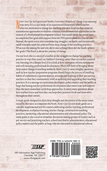 Never Give Up is an amazing true story. It is a case study of an experienced elementary school teacher who was motivated to change her teaching practices from teacher-centered, transmission approaches to student-centered, transformational approaches in the context of a Professional Development School. You would think she would have accomplished her goal with support from the PDS participants in a year or two. Instead, she spent seven years encountering struggles, set-backs, and occasionally small triumphs until she achieved bone deep change in her teaching practices. What was she aiming for and why did it take so long? How did she finally achieve her goals? This book is about her journey of change. On one level, this is a story of a teacher as she struggles to change her teaching practice in ways that center on children's learning rather than on teacher centered rote learning. On a deeper level, it is a look at how innovative reform movements and well-meaning professional development efforts fall short of bringing about deep seated change in teaching methods. It raises weighty questions such as how teacher preparation programs should begin the process of instilling habits of exploration, experimentation, research and learning in their pre-service teachers so that they continuously work at updating and upgrading their teaching practices. It is a message to curriculum developers, policy makers and the public at large that lasting teacher professional development takes more time and support than the more immediate workshop approaches. It raises many questions about how teachers learn and how they can keep their practices fresh and innovative throughout their careers. A study guide designed to elicit deep thought and discussion of the many issues raised by this story accompanies the book. The book and study guide are a valuable supplemental text for courses addressing teacher learning, professional development, workplace learning, teacher change, constructivist teaching practices, mentoring, educational administration and educational policy. The study guide is also a tool to stimulate discussion among groups of readers such as pre-service and practicing teachers, school and district administrators, educational policy makers and the public at large who are interested in educational reform.