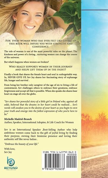 For every woman who has ever felt like giving up this book will infuse you with strength and confidence. The role of the woman is one of the most powerful roles on the planet. The kindness and power of a loving, nurturing woman can change the course of the universe. But what's happens when women are broken? Who really supports women in their journey and helps lift them up in the fight? Finally, a book that shares the female heart and soul in an unforgettable way. In, NEVER GIVE UP, Sev Joy shares her fascinating story of orphanage life, hunger, and survival. From being her brother's only caregiver at the age of six to living a life of contentment, Sev challenges others to embrace their greatness, embrace forgiveness and accept all that is possible. When she speaks she shares her heart on stage all over the globe. "Sev shares her powerful story of a little girl in Poland who, against all odds, believed that the dreams in her heart could be realized... Sev's words will awaken you to the desires of your heart as you begin to own your truth and emerge into the fullest expression of who you're here to be." Michelle Madrid-Branch Author, Speaker, International Adoptee, & Life Coach for Women Sev is an International Speaker, Best-Selling Author who helps ambitious women come back to the gift of joyful living by finding their purpose, owning their feminine presence, and loving their authentic self like never before. "Embrace the beauty of your life." With love, Sev Joy
