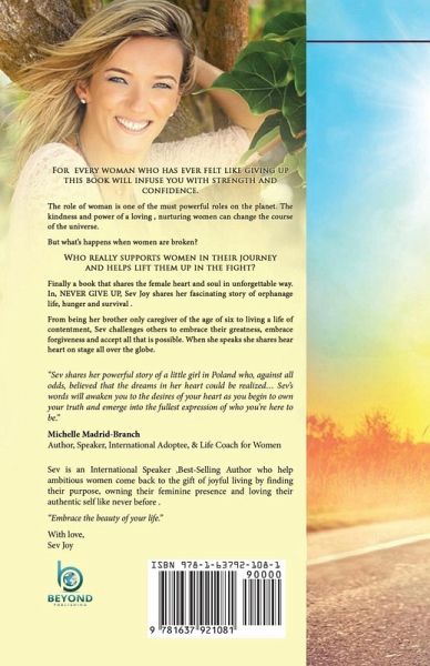 For every woman who has ever felt like giving up this book will infuse you with strength and confidence. The role of the woman is one of the most powerful roles on the planet. The kindness and power of a loving, nurturing woman can change the course of the universe. But what's happens when women are broken? Who really supports women in their journey and helps lift them up in the fight? Finally, a book that shares the female heart and soul in an unforgettable way. In, NEVER GIVE UP, Sev Joy shares her fascinating story of orphanage life, hunger, and survival. From being her brother's only caregiver at the age of six to living a life of contentment, Sev challenges others to embrace their greatness, embrace forgiveness and accept all that is possible. When she speaks she shares her heart on stage all over the globe. "Sev shares her powerful story of a little girl in Poland who, against all odds, believed that the dreams in her heart could be realized... Sev's words will awaken you to the desires of your heart as you begin to own your truth and emerge into the fullest expression of who you're here to be." Michelle Madrid-Branch Author, Speaker, International Adoptee, & Life Coach for Women Sev is an International Speaker, Best-Selling Author who helps ambitious women come back to the gift of joyful living by finding their purpose, owning their feminine presence, and loving their authentic self like never before. "Embrace the beauty of your life." With love, Sev Joy