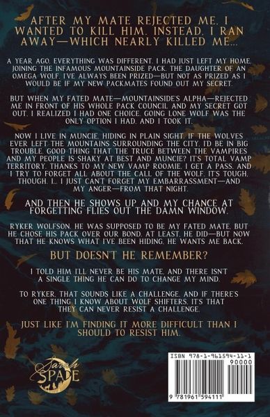 After my mate rejected me, I wanted to kill him. Instead, I ran away-which nearly killed me... A year ago, everything was different. I had just left my home, joining the infamous Mountainside Pack. The daughter of an omega wolf, I've always been prized-but not as prized as I would be if my new packmates found out my secret. But when my fated mate-Mountainside's Alpha-rejected me in front of his whole pack council and my secret got out, I realized I had one choice. Going lone wolf was the only option I had, and I took it. Now I live in Muncie, hiding in plain sight. If the wolves ever left the mountains surrounding the city, I'd be in big trouble. Good thing that the truce between the vampires and my people is shaky at best and Muncie? It's total vamp territory. Thanks to my new vamp roomie, I get a pass, and I try to forget all about the call of the wolf. It's tough, though. I... I just can't forget my embarrassment-and my anger-from that night. And then he shows up and my chance at forgetting flies out the damn window. Ryker Wolfson. He was supposed to be my fated mate, but he chose his pack over our bond. At least, he did-but now that he knows what I've been hiding, he wants me back. But doesn't he remember? I told him I'll never be his mate, and there isn't a single thing he can do to change my mind. To Ryker, that sounds like a challenge. And if there's one thing I know about wolf shifters, it's that they can never resist a challenge. Just like I'm finding it more difficult than I should to resist him.