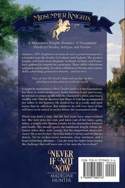 Summer, 1193. England is in turmoil, and a great tournament is scheduled near the border of Scotland and England. The greatest knights and lords from England, Scotland, Ireland, and France have gathered to compete for a great prize. There will be celebrations and jousts and feasting. It will an exhibition of chivalry and warrior skills, a breeding ground for treason...and for love. They call him The Devil's Blade and say that the fires of hell burn in him when he wields his sword. It might be midsummer when Zander arrives at the tournament, but there is winter in his soul. Battle-hardened and war-weary, he intends to amass spoils, win the champion's prize, and find a wealthy wife. Then he discovers that Elinor of York has accompanied her father to the tourney. He desired her as a youth, and soon learns that he still does. But whatever he will ever have of her will have to be seized in secret, before the tournament ends. Elinor was born a lady, but the last years have impoverished her. She now sews for coin, and takes care of her lame, aging father, a knight who blames Zander for his diminished fortunes and health. She should ignore the handsome knight whom she teased when they were young, but his magnetism draws her closer. He is not for her-he is her father's enemy and she has no dowry. Yet he evokes sweet memories, deep emotions, and a heart-wrenching dilemma- Can she keep her father from issuing the challenge that will leave one of the men she loves dead?
