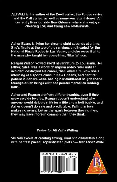 Asher Evans is living her dreams eight seconds at a time. She's finally at the top of the rankings and headed for the National Finals Rodeo in Las Vegas, and she owes it all to the man who taught her everything, Silas Wilson. Reagan Wilson vowed she'd never return to Louisiana. Her father, Silas, had been a world champion rodeo rider until an accident destroyed his career, then killed him. Now she's interning at a sports clinic in New Orleans, and her first patient is Asher Evans. Seeing her childhood neighbor and teenage crush brings all those painful memories rushing back. Asher and Reagan are from different worlds, even if they grew up side by side. Reagan doesn't understand why anyone would risk their life for a title and belt buckle, and Asher doesn't do safe and predictable. Falling in love makes no sense, but as the spark between them ignites they may have more in common than they think.