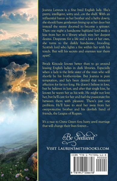 Joanna Lennox is a fine bred English lady. She's pretty, intelligent, witty and...on the shelf. With an influential baron as her brother and a hefty dowry, she should have gentleman lining up at her door but instead she seems doomed to become a spinster. Then one night a handsome highland lord steals a kiss from her in a library which stirs her deepest desires. Desperate for a life and a love of her own, she turns to the darkly handsome, brooding, Scottish lord who lights a fire within her with his touch. But will his secrets and enemies tear them apart? Brock Kincade knows better than to go around kissing English ladies in dark libraries. Especially when a lady is the little sister of the man who will shortly be his brother-in-law. But Joanna is pure temptation, and he's been denied that innocent affection for far too long. He doesn't believe in love, but he believes in lust, and after that single kiss, he knows he wants her as his wife. He might not love her, but he'll care for her and fuel the passionate fire between them with pleasure. There's just one problem: He'll have to steal her away from her overprotective brother and his devilish band of friends, the League of Rogues. It's a race to Greta Green fora hasty anvil marriage that will change their lives forever...