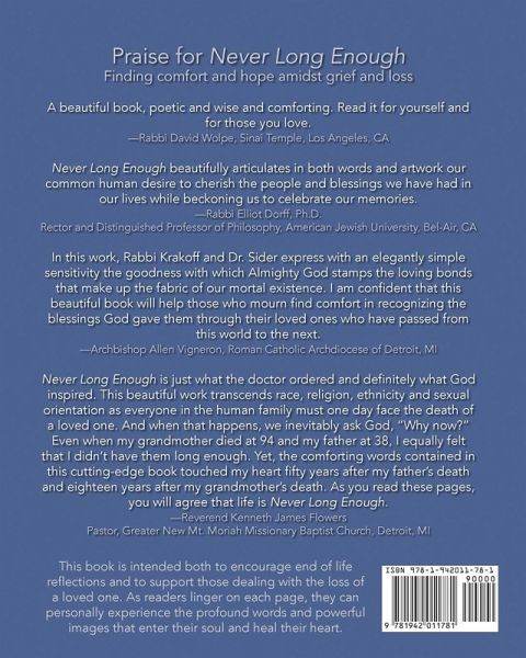 In creating Never Long Enough - a unique book about the end of life, Rabbi Joseph H. Krakoff and artist Dr. Michelle Y. Sider brought together their many years of professional expertise with families. Krakoff drew on lessons learned in many years of counseling adults and children wrestling with death, grief and remembrance. Sider’s years working as an artist, arts educator and psychologist influenced her approach in creating evocative images that demonstrate how art can help to unlock emotions and heal the heart. Together, they crafted an interactive keepsake book for families and friends, complete with pages to add personal reflections thereby transforming the book into an individualized tribute to a loved one. Never Long Enough is designed to be read along with someone nearing the end of life — or, it can be read by mourners after a death. Whenever this book is opened, it becomes an active invitation for conversation, lifting up memories and preserving the legacy of someone’s life. "For many years, I’ve been working with families to guide them through honest conversations about the legacy and the values that remain even as someone we love dies," Krakoff says. "This text has already comforted so many families through this difficult, emotionally charged time." "I’ve seen how art can help people express themselves, bring out their feelings and tell stories. By weaving the words and art together, I hope the reader will move slowly through the pages and reflect deeply on the words. Reading and responding to this book as an individual or with loved ones becomes a very compelling and helpful experience." says Sider. Krakoff originally developed the thought-provoking text while in Rabbinical School at the Jewish Theological Seminary in New York City. As he shared that text with families, he realized that powerful imagery would heighten the healing process of reflection. Sider, inspired by the text, envisioned pairing phrases in the poem to original art. Using various techniques, she created stirring images that powerfully illuminate the text, are inclusive of different ethnicities, religions and relationships and culminate in a final, powerful blend. Never Long Enough begins with a dedication page to fill in: "This book is presented to: ___________________." Quantity purchasers of Never Long Enough can customize the front cover with a logo and the inside with a sponsor’s note — perhaps from a hospital, hospice, house of worship or funeral home who are providing this resource to families. ¿ "A beautiful book, poetic and wise and comforting. Read it for yourself and for those you love." Rabbi David Wolpe, Sinai Temple, Los Angeles, CA "In this work, Rabbi Krakoff and Dr. Sider express with an elegantly simple sensitivity the goodness with which Almighty God stamps the loving bonds that make up the fabric of our mortal existence. I am confident that this beautiful book will help those who mourn find comfort in recognizing the blessings God gave them through their loved ones who have passed from this world to the next." Archbishop Allen Vigneron, Roman Catholic Archdiocese of Detroit, MI