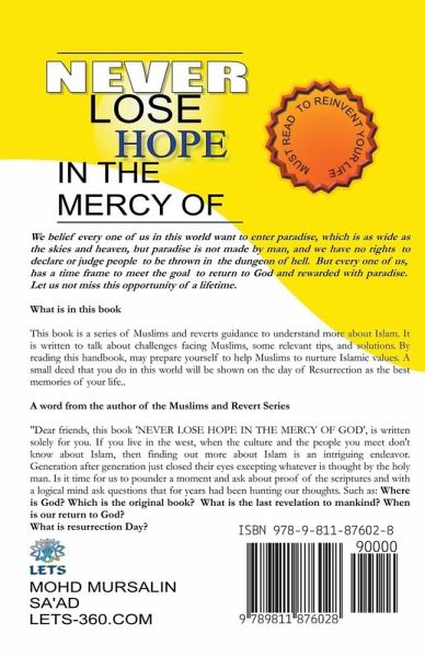 Review by the author: We belief every one of us in this world want to enter paradise, which is as wide as the skies and heaven, but paradise is not made by man, and we have no rights to declare or judge people to be thrown in the dungeon of hell. But every one of us, has a time frame to meet the goal to return to God and rewarded with paradise. Let us not miss this opportunity of a lifetime. What is in this book This book is a series of Muslims and reverts guidance to understand more about Islam. It is written to talk about challenges facing Muslims, some relevant tips, and solutions. By reading this handbook, may prepare yourself to help Muslims to nurture Islamic values. A small deed that you do in this world will be shown on the day of Resurrection as the best memories of your life. Objective of this book This small handbook Is written to survive the ordeal of life and urgent hope of God's mercy upon us. When we are deprived of help, there is no other to turn to, but One God who hears your needs and supplication. We will talk about hope in this life and hereafter, without defaming any religious thoughts or concept of worship. We are here to open talks without boundaries to just find a link between our life and the path designed by our Lord and follow the cues from the prophets who had received holy books. And perhaps from reading this book, you will find enlightenment and truth for the one God and release us from ignorance and to the knowledge with facts of this hope of salvation and happiness for the rest of our lives. A word from the author of the Muslims and Revert Series "Dear friends, this book 'NEVER LOSE HOPE IN THE MERCY OF GOD', is written solely for you. If you live in the west, when the culture and the people you meet don't know about Islam, then finding out more about Islam is an intriguing endeavor. You look around and people adapt to their culture. Having parties, drinking, and mixing with such people will drag you to a point where you will be addicted to drugs and possibly being homeless." Therefore, reading this book about the mercy of God could be the key to helping you find guidance and keep away from those temptations. Generation after generation just closed their eyes excepting whatever is thought by the holy man. Is it time for us to pounder a moment and ask about proof of the scriptures and with a logical mind ask questions that for years had been hunting our thoughts. Such as: Where is God? Which is the original book? What is the last revelation to mankind? When is our return to God? What is resurrection Day? What happens to the soul after our death? These questions should be answered, at least a person can decide his true path in life, while time is limited. The urgency to witness the oath of faith is vital to proof your faith in ONE GOD WHO CREATED THIS UNIVERSE AND EVERTHING IN IT. SAY, O MY LORD SHOW AND GUIDE ME TO THE TRUTH. AND LET ME ENTER PARADISE WITH YOUR BLESSINGS. AMEEN! The holy man in your state can't answer these questions? He talks like the tongue of a snake. Whispering lies and defamation without evidence. It is your TURN NOW, to start searching for truth, and find the real God and the real religion. This handy book was furnished with lots of evidence, and you can read more of this Islamic and Muslim series books. The only salvation is by starting to read books, listen to sermons, sit among scholars, ask lots of questions. And most importantly read and understand the word of God presented to man via messenger Mohammad peace be upon him. The Quran is the only evidence and guide for man.