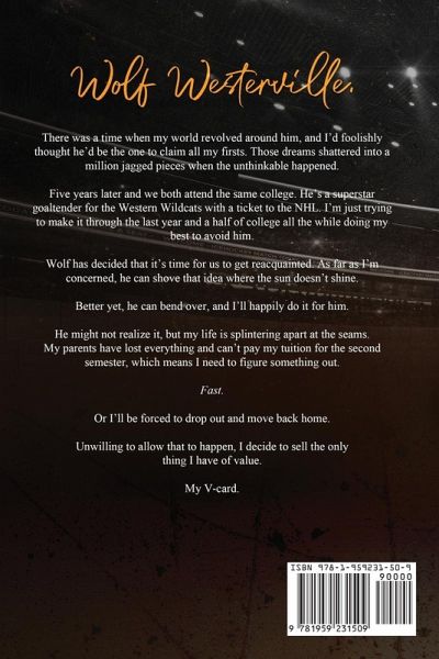 Wolf Westerville. There was a time when my world revolved around him, and I'd foolishly thought he'd be the one to claim all my firsts. Those dreams shattered into a million jagged pieces when the unthinkable happened. Five years later and we both attend the same college. He's a superstar goaltender for the Western Wildcats with a ticket to the NHL. I'm just trying to make it through the last year and a half of college all the while doing my best to avoid him. Wolf has decided that it's time for us to get reacquainted. As far as I'm concerned, he can shove that idea where the sun doesn't shine. Better yet, he can bend over, and I'll happily do it for him. He might not realize it, but my life is splintering apart at the seams. My parents have lost everything and can't pay my tuition for the second semester, which means I need to figure something out. Fast. Or I'll be forced to drop out and move back home. Unwilling to allow that to happen, I decide to sell the only thing I have of value. My V-card.
