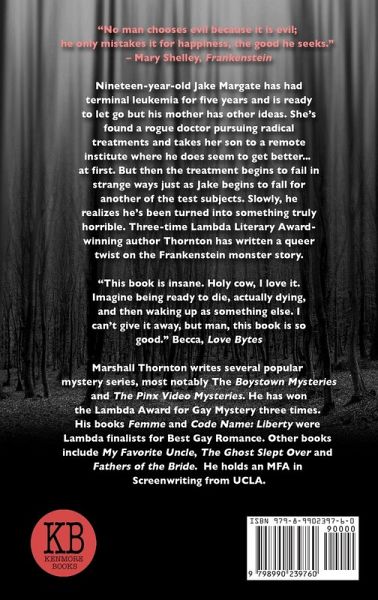 Nineteen-year-old Jake Margate has had terminal leukemia for five years and is ready to let go but his mother has other ideas. She's found a rogue doctor pursuing radical treatments and takes her son to a remote institute where he does seem to get better...at first. But then the treatment begins to fail in strange ways just as Jake begins to fall for another of the test subjects. Slowly, he realizes he's been turned into something truly horrible. Three-time Lambda Literary Award-winning author Thornton has written a contemporary queer twist on the Frankenstein monster story.