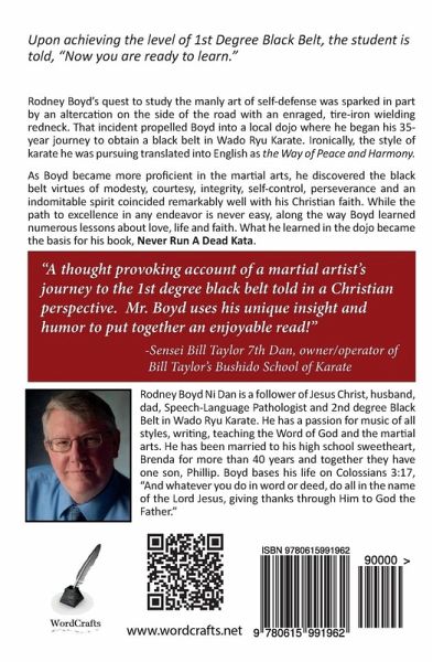 Upon achieving the level of 1st Degree Black Belt, the student is told, "Now you are ready to learn." Rodney Boyd's quest to study the manly art of self-defense was sparked in part by an altercation on the side of the road with an enraged, tire-iron wielding redneck. That incident propelled Boyd into a local dojo where he began his 35-year journey to obtain a black belt in Wado Ryu Karate. Ironically, the style of karate he was pursuing translated into English as the Way of Peace and Harmony. As Boyd became more proficient in the martial arts, he discovered the black belt virtues of modesty, courtesy, integrity, self-control, perseverance and an indomitable spirit coincided remarkably well with his Christian faith. While the path to excellence in any endeavor is never easy, along the way Boyd learned numerous lessons about love, life and faith. What he learned in the dojo became the basis for his book, Never Run A Dead Kata.