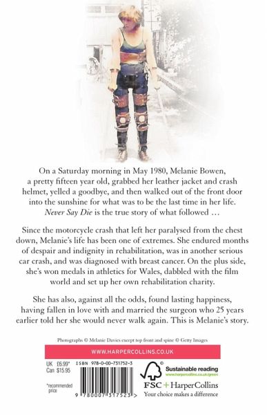 On a Saturday morning in May 1980, Melanie Bowen, a pretty fifteen year old, ran down the stairs of her parents' home in Port Talbot, grabbed her leather jacket and crash helmet, yelled a goodbye, and then walked out of the front door into the sunshine for what was to be the last time in her life. Never Say Die is the true story of what followed...