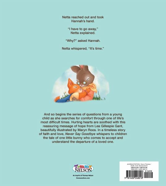 This comforting story of saying goodbye to a loved one with faith and love will bring hope and healing to children grieving a loss. As a bunny asks questions about her grandmother's departure, little ones will learn that memories and love never go away, and they will be encouraged with the promise of a heavenly reunion. This sweet and sensitive illustrated picture book is for * children 4 to 8 * families experiencing a death * ministers, church workers, and counselors helping those who grieve * an Easter-time story to start a family discussion about heaven Hurting hearts will be healed with hope as your family shares Never Say Goodbye by Lea Gant and beautifully illustrated by Maryn Roos.