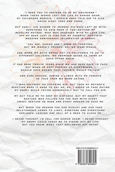 "I need you to pretend to be my girlfriend." When those words left the lips of Damien Shaw, my childhood nemesis, I should have told him to kick rocks right then and there. But sadly, his scheme to impress his boss left me with something to gain from it too-getting my meddling mother, who was obsessed with my love life, off my back just in time for my parents' thirtieth wedding anniversary celebration in Hawaii. You see, Damien and I grew up together, but we weren't friends. No-we were rivals. And when we both moved out to California to go to different colleges, we promised never to think of each other again. It had been twelve years since we had been face to face, but when he kept popping up everywhere, I should have known that trouble would follow. And sure enough, during a lunch with my parents he told them we were dating. I was hellbent on exposing him, but then my mother's reaction made it hard to say no. So, I ended up fake dating my enemy while trying desperately not to fall for him. My gut told me to keep my distance. But my heart? That bastard was falling for the man with every sweet gesture he made and every orgasm he gave me. But when the reason for our rivalry and our fake relationship comes to light, everyone and everything explodes, leaving one hell of a mess to clean up. I never thought I'd fall for Damien Shaw. I never thought my enemy could force me to figure out my life. But you know what they say-never say never. TW: toxic parental relationships