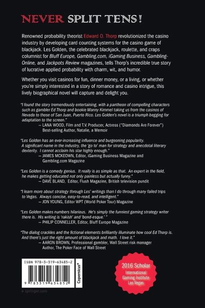 "Never split tens!, Golden's prose evokes for the reader the aura of casino action and the excitement of card play in the midst of counting cards and verifying theorems. ... Golden's book is a celebration of how Thorp secured his." (Andrew James Simoson, Mathematical Reviews, April, 2018)