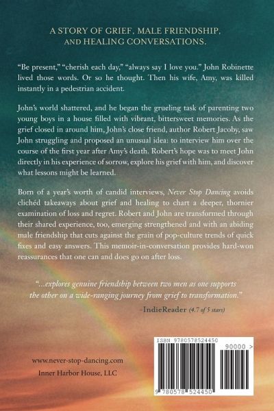 A story of grief, male friendship, and healing conversations. "Be present," "cherish each day," "always say I love you." John Robinette lived those words. Or so he thought. Then his wife, Amy, was killed instantly in a pedestrian accident. John’s world shattered, and he began the grueling task of parenting two young boys in a house filled with vibrant, bittersweet memories. As the grief closed in around him, John’s close friend, author Robert Jacoby, saw John struggling and proposed an unusual idea: to interview him over the course of the first year after Amy’s death. Robert’s hope was to meet John directly in his experience of sorrow, explore his grief with him, and discover what lessons might be learned. Born of a year’s worth of candid interviews, Never Stop Dancing avoids clichéd takeaways about grief and healing to chart a deeper, thornier examination of loss and regret. Robert and John are transformed through their shared experience, too, emerging strengthened and with an abiding male friendship that cuts against the grain of pop-culture trends of quick fixes and easy answers. This memoir-in-conversation provides hard-won reassurances that one can and does go on after loss.