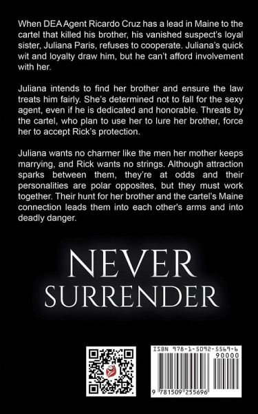 When DEA Agent Ricardo Cruz has a lead in Maine to the cartel that killed his brother, his vanished suspect's loyal sister, Juliana Paris, refuses to cooperate. Juliana's quick wit and loyalty draw him, but he can't afford involvement with her. Juliana intends to find her brother and ensure the law treats him fairly. She's determined not to fall for the sexy agent, even if he is dedicated and honorable. Threats by the cartel, who plan to use her to lure her brother, force her to accept Rick's protection. Juliana wants no charmer like the men her mother keeps marrying, and Rick wants no strings. Although attraction sparks between them, they're at odds and their personalities are polar opposites, but they must work together. Their hunt for her brother and the cartel's Maine connection leads them into each other's arms and into deadly danger.