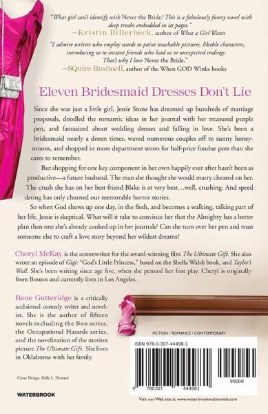 "What girl can't identify with Never the Bride? This is a fabulously funny novel with deep truths embedded in its pages.” -Kristin Billerbeck, author of What a Girl Wants "I admire writers who employ words to paint touchable pictures, likable characters, introducing us to instant friends who lead us to unexpected endings. That's why I love Never The Bride.” -SQuire Rushnell, author of the When GOD Winks books Eleven Bridesmaid Dresses Don't Lie Since she was just a little girl, Jessie Stone dreamed up hundreds of marriage proposals, doodled the romantic ideas in her journal with her treasured purple pen, and fantasized about wedding dresses and falling in love. She's been a bridesmaid nearly a dozen times, waved numerous couples off to sunny honeymoons, and shopped in more department stores for half-price fondue pots than she cares to remember. But shopping for one key component of these countless proposals hasn't been quite as productive-a future husband. The man she thought she would marry cheated on her. The crush she has on her best friend Blake is at very best...well, crushing. And speed dating has only churned out memorable horror stories. So when God shows up one day, in the flesh, and becomes a walking, talking part of her life, Jessie is skeptical. What will it take to convince her that the Almighty has a better plan than one she's already cooked up in her journals? Can she turn over her pen and trust someone else to craft a love story beyond her wildest dreams? Cheryl McKay is the screenwriter for the award-winning film The Ultimate Gift. She also wrote an episode of Gigi: God's Little Princess, based on the book by Sheila Walsh, and Taylor's Wall, a drama about high-school violence. She's been writing since the tender age of five when she penned her first play. Cheryl is originally from Boston, Massachusetts, and currently lives in Los Angeles. Rene Gutteridge is a critically acclaimed comedy writer and novelist. She is the author of fifteen novels including the Boo series, My Life as a Doormat, the Occupational Hazards series, and the novelization of the motion picture The Ultimate Gift. She lives in Oklahoma with her family.
