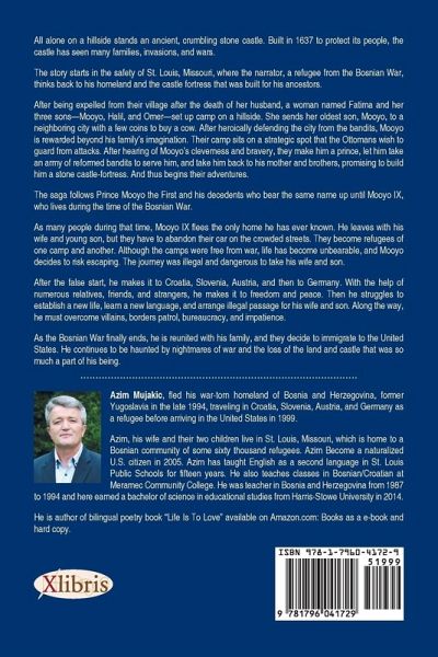 All alone on a hillside stands an ancient, crumbling stone castle. Built in 1637 to protect its people, the castle has seen many families, invasions, and wars. The story starts in the safety of St. Louis, Missouri, where the narrator, a refugee from the Bosnian War, thinks back to his homeland and the castle fortress that was built for his ancestors. After being expelled from their village after the death of her husband, a woman named Fatima and her three sons-Mooyo, Halil, and Omer-set up camp on a hillside. She sends her oldest son, Mooyo, to a neighboring city with a few coins to buy a cow. After heroically defending the city from the bandits, Mooyo is rewarded beyond his family's imagination. Their camp sits on a strategic spot that the Ottomans wish to guard from attacks. After hearing of Mooyo's cleverness and bravery, they make him a prince, let him take an army of reformed bandits to serve him, and take him back to his mother and brothers, promising to build him a stone castle-fortress. And thus begins their adventures. The saga follows Prince Mooyo the First and his decedents who bear the same name up until Mooyo IX, who lives during the time of the Bosnian War. As many people during that time, Mooyo IX flees the only home he has ever known. He leaves with his wife and young son, but they have to abandon their car on the crowded streets. They become refugees of one camp and another. Although the camps were free from war, life has become unbearable, and Mooyo decides to risk escaping. The journey was illegal and dangerous to take his wife and son. After the false start, he makes it to Croatia, Slovenia, Austria, and then to Germany. With the help of numerous relatives, friends, and strangers, he makes it to freedom and peace. Then he struggles to establish a new life, learn a new language, and arrange illegal passage for his wife and son. Along the way, he must overcome villains, borders patrol, bureaucracy, and impatience. As the Bosnian War finally ends, he is reunited with his family, and they decide to immigrate to the United States. He continues to be haunted by nightmares of war and the loss of the land and castle that was so much a part of his being.