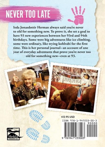 An inspirational true story of a year-long mission for ninety-three new experiences a nonagenarian undertook to show it's never too late for something new. Between her 93rd and 94th birthdays, Ieda Jonasdottir Herman committed to finding ninety-three things she had never done before as part of her ongoing effort to motivate others to live life with vitality. The result was a year of ordinary adventures that prove you're never too old for something new - even at 93.