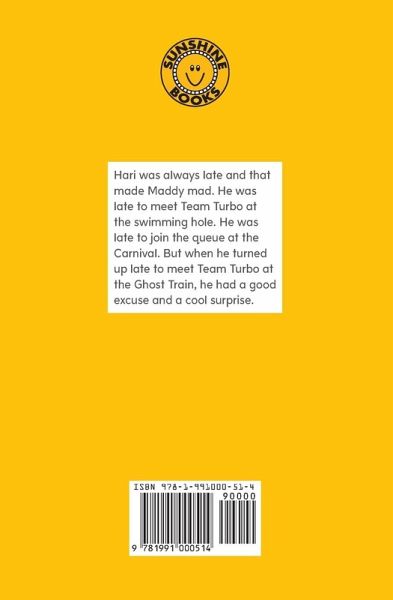 Hari was always late and that made Maddy mad. He was late to meet Team Turbo at the swimming hole. He was late to join the queue at the Carnival. But when he turned up late to meet Team Turbo at the Ghost Train, he had a good excuse and a cool surprise.