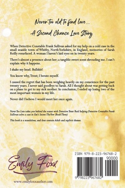 Never too old to find love... A Second Chance Love Story. When Detective Constable Frank Sullivan asked for my help on a cold case in the small seaside town of Whitby, North Yorkshire, in England, memories of Sarah Reilly resurfaced. A woman I haven't laid eyes on in twenty years. There's almost a presence about her; a tangible sweet scent shrouding me. I can't explain why it happens. I shake my head. Bullshit! You know why, Trent; I berate myself. I caused the regret that has been weighing heavily on my conscience for the past twenty years. I never said goodbye to Sarah. All I thought about was getting back on a plane to get to my sick mother. In conclusion; I ended up losing two of the most important women in my life. Never did I believe I would meet her once again. Never Too Late takes you behind the scenes with Detective Trent Reid helping Detective Constable Frank Sullivan solve a case in Em's Secret: The Vow (Book Three) Book is a standalone, and does contain Adult and explicit themes.