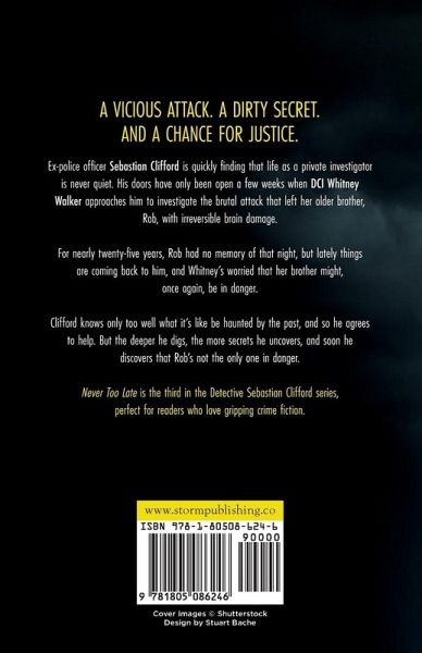 A vicious attack. A dirty secret. And a chance for justice Ex-police officer Sebastian Clifford is quickly finding that life as a private investigator is never quiet. His doors have only been open a few weeks when DCI Whitney Walker approaches him to investigate the brutal attack that left her older brother, Rob, with irreversible brain damage. For nearly twenty-five years, Rob had no memory of that night, but lately things are coming back to him, and Whitney's worried that her brother might, once again, be in danger. Clifford knows only too well what it's like be haunted by the past, and so he agrees to help. But the deeper he digs, the more secrets he uncovers, and soon he discovers that Rob's not the only one in danger. Never Too Late is the third in the Detective Sebastian Clifford series, perfect for readers who love gripping crime fiction.