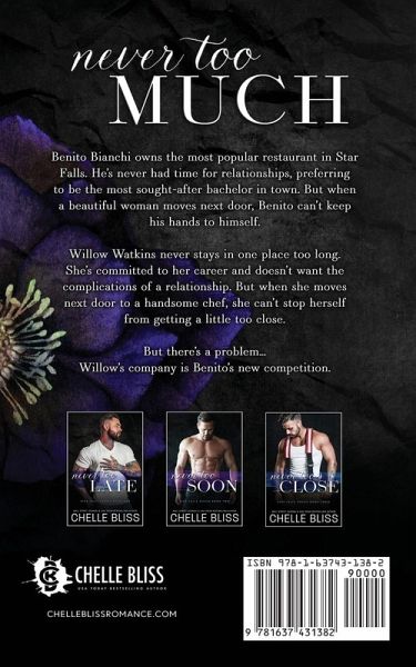 Benito Bianchi owns the most popular restaurant in Star Falls. He's never had time for relationships, preferring to be the most sought-after bachelor in town. But when a beautiful woman moves next door, Benito can't keep his hands to himself. Willow Watkins never stays in one place too long. She's committed to her career and doesn't want the complications of a relationship. But when she moves next door to a handsome chef, she can't stop herself from getting a little too close. But there's a problem...Willow's company is Benito's new competition. Never Too Much is the last book in the Star Falls series and is a small town, age gap, and enemies to lovers romance.