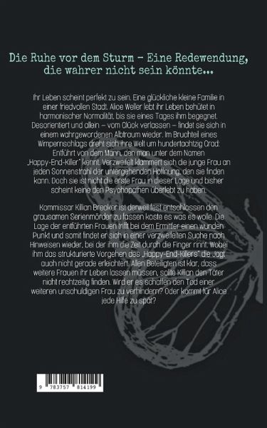 Ihr Leben scheint perfekt zu sein. Eine glückliche kleine Familie in einer friedvollen Stadt. Alice Weller lebt ihr Leben behütet in harmonischer Normalität, bis sie eines Tages ihm begegnet. Desorientiert und allein - vom Glück verlassen - findet sie sich in einem wahrgewordenen Albtraum wieder. Im Bruchteil eines Wimpernschlags dreht sich ihre Welt um hundertachtzig Grad: Entführt von dem Mann, den man unter dem Namen "Happy-End-Killer" kennt. Verzweifelt klammert sich die junge Frau an jeden Sonnenstrahl der untergehenden Hoffnung, den sie finden kann. Doch sie ist nicht die erste Frau in dieser Lage und bisher scheint keine den Psychopathen überlebt zu haben.Kommissar Killian Brecker ist derweil fest entschlossen den grausamen Serienmörder zu fassen koste es was es wolle. Die Lage der entführten Frauen trifft bei dem Ermittler einen wunden Punkt und somit findet er sich in einer verzweifelten Suche nach Hinweisen wieder, bei der ihm die Zeit durch die Finger rinnt. Wobei ihm das strukturierte Vorgehen des "Happy-End-Killers" die Jagt auch nicht gerade erleichtert. Allen Beteiligten ist klar, dass weitere Frauen ihr Leben lassen müssen, sollte Killian den Täter nicht rechtzeitig finden. Wird er es schaffen den Tod einer weiteren unschuldigen Frau zu verhindern? Oder kommt für Alice jede Hilfe zu spät?
