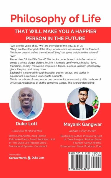 "They" have the voice - the stage - the power to represent! "They" had the right to write history favoring their beliefs! It's time for a collective theory of acceptance! It's time for "WE" to speak. Let's stand together. "Never What We Wanna Say" is the voice of all! "We" is for everyone! United, we stand, envisioning the idea that the whole world is our family, where we all admire each other's existence. This is not a book of entertainment - but a book of giving weight to the unheard voices! The philosophy of life, where every emotion is valued and expressed in detail - be it love, sadness, mental health, freedom, loss, success, guilt, or forgiveness. Life is simplified through powerful theories like the "Smile-Cry Paradox," "Walking With Guilt," "The Race Talk," and the "Philosophy of Life." "Never What We Wanna Say" is a must-read! Written by two international bestselling authors - Duke Lott and Mayank Gangwar from America and India, respectively - this book represents the ideas of universal acceptance. "We" values all! Duke Lott & Mayank Gangwar