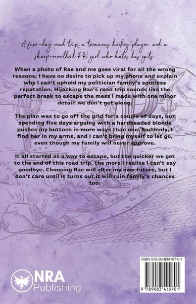 A five-day road trip, a tenacious hockey player, and a sharp-mouthed PR girl who hates his guts. A five-day road trip, a tenacious hockey player, and a sharp-mouthed PR girl who hates his guts. When a photo of Rae and I goes viral for all the wrong reasons, I have no desire to pick up my phone and explain why I can't uphold my politician family's spotless reputation. Hijacking Rae's road trip sounds like the perfect break to escape the mess I made with one minor detail: we don't get along. The plan was to go off the grid for a couple of days, but spending five days arguing with a hardheaded blonde pushes my buttons in more ways than one. Suddenly, I find her in my arms, and I can't bring myself to let go, even though my family will never approve. It all started as a way to escape, but the quicker we get to the end of this road trip, the more I realize I can't say goodbye. Choosing Rae will alter my own future, but I don't care until it turns out it will ruin family's chances too. Fans of Kandi Steiner & Melanie Harlow will enjoy this forced proximity romance filled with banter! Scroll up, one click, and start reading today!