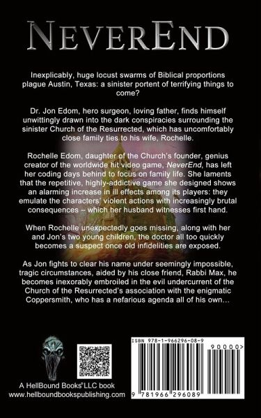 Inexplicably, huge locust swarms of Biblical proportions plague Austin, Texas: a sinister portent of terrifying things to come? Dr. Jon Edom, hero surgeon, loving father, finds himself unwittingly drawn into the dark conspiracies surrounding the sinister Church of the Resurrected, which has uncomfortably close family ties to his wife, Rochelle. Rochelle Edom, daughter of the Church's founder, genius creator of the worldwide hit video game, NeverEnd, has left her coding days behind to focus on family life. She laments that the repetitive, highly-addictive game she designed shows an alarming increase in ill effects among its players: they emulate the characters' violent actions with increasingly brutal consequences - which her husband witnesses first hand. When Rochelle unexpectedly goes missing, along with her and Jon's two young children, the doctor all too quickly becomes a suspect once old infidelities are exposed. As Jon fights to clear his name under seemingly impossible, tragic circumstances, aided by his close friend, Rabbi Max, he becomes inexorably embroiled in the evil undercurrent of the Church of the Resurrected's association with the enigmatic Coppersmith, who has a nefarious agenda all of his own...