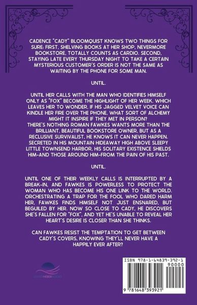 "Cadence "Cady" Bloomquist knows two things for sure: First, shelving books at her shop, Nevermore Bookstore, totally counts as cardio. Second, staying late every Thursday night to take a certain mysterious customer's order is not the same as waiting by the phone for some man. Until the calls with the man who identifies himself only as "Fox" last for hours, and become the highlight of her week. Which leaves her to wonder, if his jagged velvet voice can kindle her fire over the phone, what sort of alchemy might it inspire if they met in person? There's nothing Roman Fawkes wants more than the brilliant, beautiful bookstore owner, but Roman Fawkes knows it can never happen. Secreted in his mountain hideaway high above sleepy little Townsend Harbor, his hermit's existence shields him-and those around him-from the pain of his past. Until one of their weekly calls is interrupted by a break-in, and Fawkes is powerless to protect the woman who has become his one link to the world. Orchestrating a trap for the fool who dared harm her, Fawkes finds himself not just ensnared, but beguiled by her. Now so close to Cady, he discovers she's fallen for "Fox", and yet he's unable to reveal her heart's desire is closer than she thinks. Can Fawkes resist the temptation to get between Cady's covers, knowing they'll never have a happily ever after?"--Back cover.