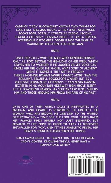 Cadence "Cady" Bloomquist knows two things for sure: First, shelving books at her shop, Nevermore Bookstore, totally counts as cardio. Second, staying late every Thursday night to take a certain mysterious customer's order is not the same as waiting by the phone for some man. Until. Until the calls with the man who identifies himself only as "Fox" last for hours, and become the highlight of her week. Which leaves her to wonder, if his jagged velvet voice can kindle her fire over the phone, what sort of alchemy might it inspire if they met in person? There's nothing Roman Fawkes wants more than the brilliant, beautiful bookstore owner, but Roman Fawkes knows it can never happen. Secreted in his mountain hideaway high above sleepy little Townsend Harbor, his hermit's existence shields him-and those around him-from the pain of his past. Until. Until one of their weekly calls is interrupted by a break-in, and Fawkes is powerless to protect the woman who has become his one link to the world. Orchestrating a trap for the fool who dared harm her, Fawkes finds himself not just ensnared, but beguiled by her. Now so close to Cady, he discovers she's fallen for "Fox", and yet he's unable to reveal her heart's desire is closer than she thinks. Can Fawkes resist the temptation to get between Cady's covers, knowing they'll never have a happily ever after?