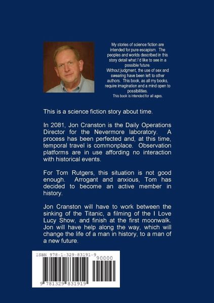 This is a science fiction story about time. In 2081, Jon Cranston is the Daily Operations Director for the Nevermore laboratory. A process has been perfected and, at this time, temporal travel is commonplace. Observation platforms are in use affording no interaction with historical events. For Tom Rutgers, this situation is not good enough. Arrogant and anxious, Tom has decided to become an active member in history. Jon Cranston will have to work between the sinking of the Titanic, a filming of the I Love Lucy Show, and finish at the first moonwalk. Jon will have help along the way, which will change the life of a man in history, to a man of a new future. Intended for readers of all ages.