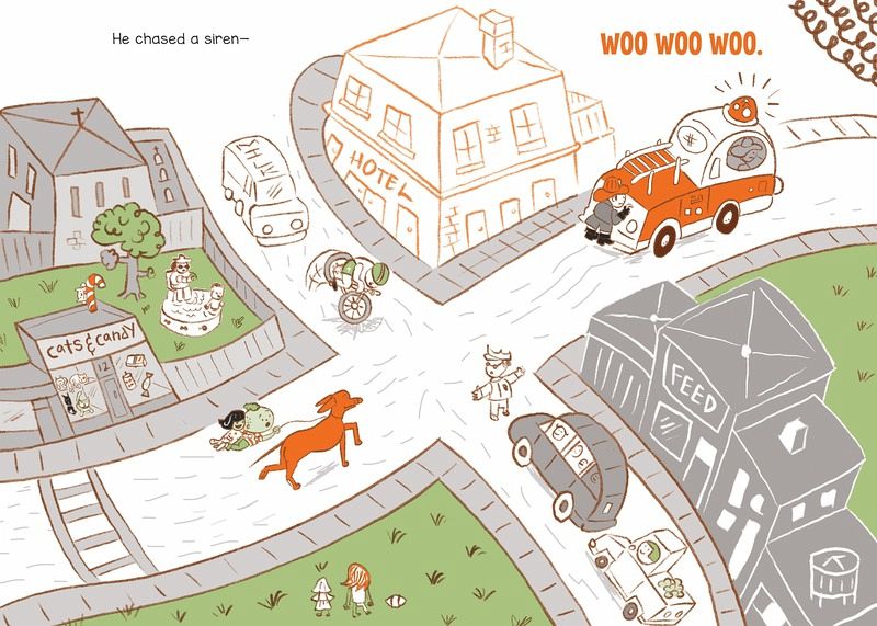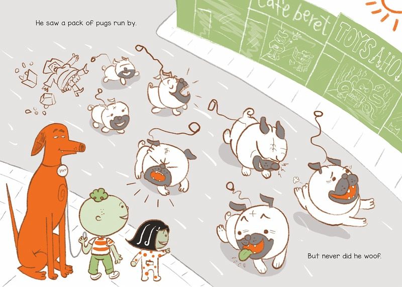 In retro pantone style, a hilarious picture book about a dog who never barks. But what will he do when a burglar threatens his home?