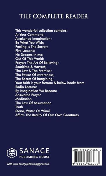 Bringing Together The Best of "Neville Goddard's" works. This wonderful collection contains: At Your Command; Awakened Imagination; Be What You Wish; Feeling Is The Secret; Five Lessons; He Dreams in me; Out Of This World; Prayer: The Art Of Believing; Seedtime & Harvest; The Law & The Promise; The Power Of Awareness; The Secret Of Imagining; Your faith is your fortune; By Imagination We Become; Answered Prayer; Meditation; The Law of Assumption; Truth; Stone, Water or Wine? And Affirm the Reality of Our Own Greatness