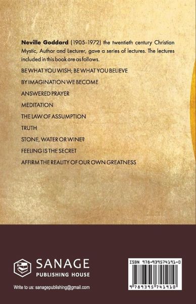 Neville Goddard (1905-1972) the twentieth century Christian Mystic, Author and Lecturer, gave a series of lectures. The lectures included in this book are as follows. BE WHAT YOU WISH; BE WHAT YOU BELIEVE BY IMAGINATION WE BECOME ANSWERED PRAYER MEDITATION THE LAW OF ASSUMPTION TRUTH STONE, WATER OR WINE? FEELING IS THE SECRET AFFIRM THE REALITY OF OUR OWN GREATNESS