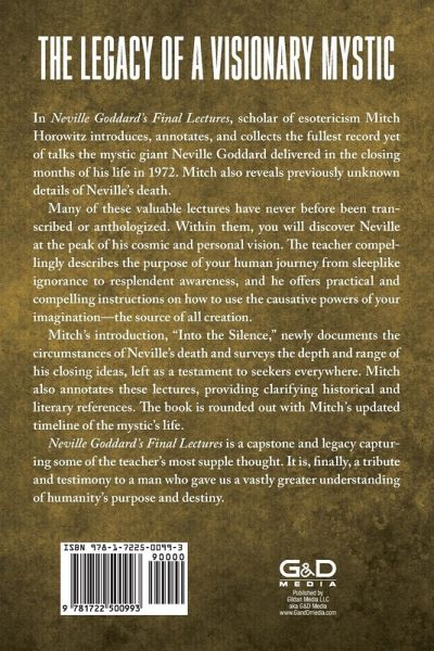 The Legacy of a Visionary Mystic In Neville Goddard's Final Lectures, scholar of esotericism Mitch Horowitz introduces, annotates, and collects the fullest record yet of talks the mystic giant Neville Goddard delivered in the closing months of his life in 1972. Mitch also reveals previously unknown details of Neville's death. Many of these valuable lectures have never before been transcribed or anthologized. Within them, you will discover Neville at the peak of his cosmic and personal vision. The teacher compellingly describes the purpose of your human journey from sleeplike ignorance to resplendent awareness, and he offers practical and compelling instructions on how to use the causative powers of your imagination-the source of all creation. Mitch's introduction, "Into the Silence," newly documents the circumstances of Neville's death and surveys the depth and range of his closing ideas, left as a testament to seekers everywhere. Mitch also annotates these lectures, providing clarifying historical and literary references. The book is rounded out with Mitch's updated timeline of the mystic's life. Neville Goddard's Final Lectures is a capstone and legacy capturing some of the teacher's most supple thought. It is, finally, a tribute and testimony to a man who gave us a vastly greater understanding of humanity's purpose and destiny.