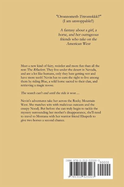 Meet a new kind of fairy-weirder and more fun than all the rest-the Rflackttt. They live under the desert in Nevada, and are a lot like humans, only they hate getting wet and have more teeth! Nevin has to earn the right to live among them by riding Blue, a wild horse sacred to their clan, and retrieving a magic noose. The search can't end until the ride is won .... Nevin's adventures take her across the Rocky Mountain West. She matches wits with malicious outcasts and the creepy Noodj. But before she can truly begin to tackle the mystery surrounding her mother's disappearance, she'll need to travel to Montana with the outrageous warrior Elsapeth to give two horses a second chance.