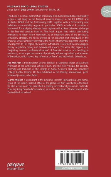 This book is a critical examination of recently introduced individual accountability regimes that apply to the financial services industry in the UK (SMCR) and Australia (BEAR and the forthcoming FAR), together with a forthcoming new individual accountability regime ( in particular, SEAR) in Ireland. It provides a framework for analysing whether these regimes will achieve behavioural change in the financial services industry. This book argues that, whilst sanctioning individuals to deter future misconduct is an important part of any successful regulatory strategy, the focus should be on ensuring that individuals in the financial services industry internalise the norms of behaviour expected under the new regimes. In this regard, the analysis in this book is informed by criminological theory, regulatory theory and behavioural science. The work also argues for a "trajectory towards professionalisation" of financial services, and banking in particular, as an important means of positively influencing industry-wide norms of behaviour, which have a key influence on firms' and individuals' behaviours.