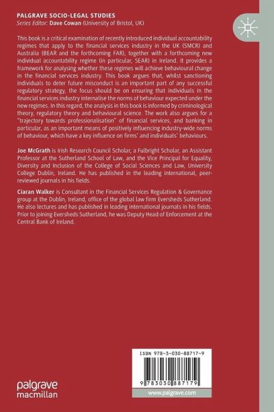 This book is a critical examination of recently introduced individual accountability regimes that apply to the financial services industry in the UK (SMCR) and Australia (BEAR and the forthcoming FAR), together with a forthcoming new individual accountability regime ( in particular, SEAR) in Ireland. It provides a framework for analysing whether these regimes will achieve behavioural change in the financial services industry. This book argues that, whilst sanctioning individuals to deter future misconduct is an important part of any successful regulatory strategy, the focus should be on ensuring that individuals in the financial services industry internalise the norms of behaviour expected under the new regimes. In this regard, the analysis in this book is informed by criminological theory, regulatory theory and behavioural science. The work also argues for a "trajectory towards professionalisation" of financial services, and banking in particular, as an important means of positively influencing industry-wide norms of behaviour, which have a key influence on firms' and individuals' behaviours.
