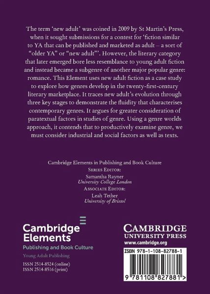 This Element uses new adult fiction as a case study to explore how genres develop in the twenty-first-century literary marketplace. It traces new adult's evolution through three key stages in order to demonstrate the fluidity that characterises contemporary genres. It argues for greater consideration of paratextual factors in studies of genre.