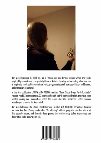In this first publication of NEW AEON POETRY, subtitled "Solar Chaos Brings Forth Fortitude" you can read 82 poems in total, 33 in Finnish and 49 in English, that have been written between the years 2005-2017 Era Vulgari. The poems are mostly inspired by esoteric influences, especially the Legacy of Aleister Crowley, not excluding the influence of other influences such as various Mythologies, symbolism, Necronomicon, et cetera. The book fits very well to the modern era of the New Aeon, especially into the context of the Finnish spiritual landscape, even describing it, where an interest towards occult subjects has been wide and is continuing to grow even further.