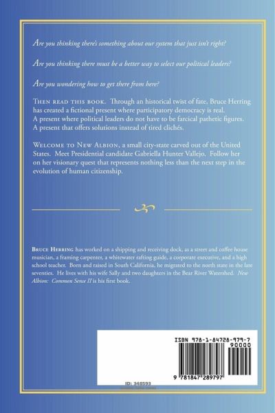 Are you thinking there's something about our system that just isn't right? Are you thinking there must be a better way to select our political leaders? Are you wondering how to get there from here? Then read this book. Through an historical twist of fate, Bruce Herring has created a fictional present where participatory democracy is real. A present where political leaders do not have to be farcical pathetic figures. A present that offers solutions instead of tired clichés. Welcome to New Albion, a small city-state carved out of the United States. Meet Presidential candidate Gabriella Hunter Vallejo. Follow her on her visionary quest that represents nothing less than the next step in the evolution of human citizenship.