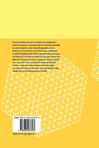 In inverse problems, the aim is to obtain, via a mathematical model, information on quantities that are not directly observable but rather depend on other observable quantities. Inverse problems are encountered in such diverse areas of application as medical imaging, remote sensing, material testing, geosciences and financing. It has become evident that new ideas coming from differential geometry and modern analysis are needed to tackle even some of the most classical inverse problems. This book contains a collection of presentations, written by leading specialists, aiming to give the reader up-to-date tools for understanding the current developments in the field.