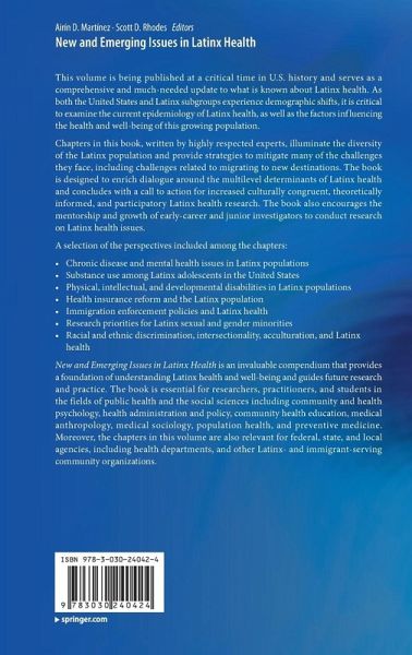 New and Emerging Issues in Latinx Health is an invaluable compendium that provides a foundation of understanding Latinx health and well-being and guides future research and practice. The book is essential for researchers, practitioners, and students in the fields of public health and the social sciences including community and health psychology, health administration and policy, community health education, medical anthropology, medical sociology, population health, and preventive medicine. Moreover, the chapters in this volume are also relevant for federal, state, and local agencies, including health departments, and other Latinx- and immigrant-serving community organizations.
