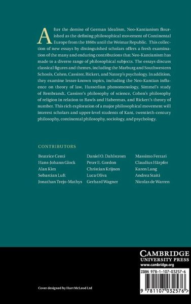 After the demise of German Idealism, Neo-Kantianism flourished as the defining philosophical movement of Continental Europe from the 1860s until the Weimar Republic. This collection of new essays by distinguished scholars offers a fresh examination of the many and enduring contributions that Neo-Kantianism has made to a diverse range of philosophical subjects. The essays discuss classical figures and themes, including the Marburg and Southwestern Schools, Cohen, Cassirer, Rickert, and Natorp's psychology. In addition they examine lesser-known topics, including the Neo-Kantian influence on theory of law, Husserlian phenomenology, Simmel's study of Rembrandt, Cassirer's philosophy of science, Cohen's philosophy of religion in relation to Rawls and Habermas, and Rickert's theory of number. This rich exploration of a major philosophical movement will interest scholars and upper-level students of Kant, twentieth-century philosophy, continental philosophy, sociology, and psychology.