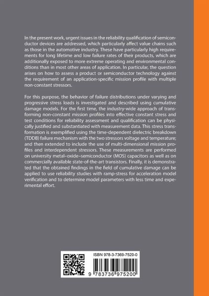 In the present work, urgent issues in the reliability qualification of semiconductor devices are addressed, which particularly affect value chains such as those in the automotive industry. These have particularly high requirements for long lifetime and low failure rates of their products, which are additionally exposed to more extreme operating and environmental conditions than in most other areas of application. In particular, the question arises on how to assess a product or semiconductor technology against the requirement of an application-specific mission profile with multiple non-constant stressors. For this purpose, the behavior of failure distributions under varying and progressive stress loads is investigated and described using cumulative damage models. For the first time, the industry-wide approach of transforming non-constant mission profiles into effective constant stress and test conditions for reliability assessment and qualification can be physically justified and substantiated with measurement data. This stress transformation is exemplified using the time-dependent dielectric breakdown (TDDB) failure mechanism with the two stressors voltage and temperature; and then extended to include the use of multi-dimensional mission profiles and interdependent stressors. These measurements are performed on university metal¿oxide¿semiconductor (MOS) capacitors as well as on commercially available state-of-the-art transistors. Finally, it is demonstrated that the obtained findings in the field of cumulative damage can be applied to use reliability studies with ramp-stress for acceleration model verification and to determine model parameters with less time and experimental effort
