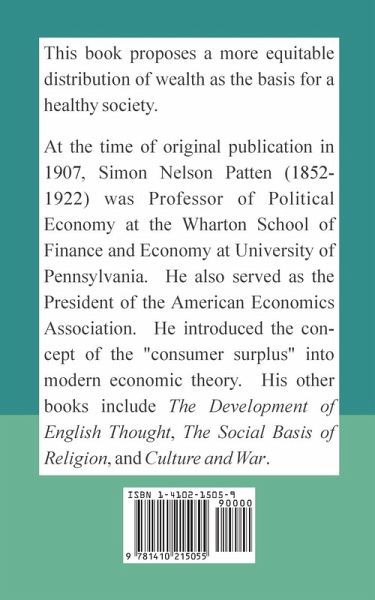This book proposes a more equitable distribution of wealth as the basis for a healthy society. At the time of original publication in 1907, Simon Nelson Patten (1852-1922) was Professor of Political Economy at the Wharton School of Finance and Economy at University of Pennsylvania. He also served as the President of the American Economics Association. He introduced the concept of the "consumer surplus" into modern economic theory. His other books include The Development of English Thought, The Social Basis of Religion, and Culture and War.