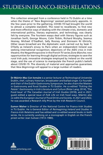 This collection emerged from a conference held in TU Dublin at a time when the theme of «New Beginnings» seemed particularly apposite. In the few years prior to the gathering, COVID-19 had brought the world to almost a complete standstill. The need to recalibrate, to find new and more effective ways of dealing with the climate crisis, domestic and international politics, literary expression, and technology, was clearly felt by everyone. The fourteen essays deal with literary figures such as Jonathan Swift, George Moore, Colm Tóibín, Richard Murphy, Seamus Heaney, Michael O'Siadhail, Sally Rooney and Doireann Ní Ghríofa. Other issues broached are the diplomatic work carried out by Seán T. O'Kelly as Ireland's envoy to Paris when an independent Ireland was seeking international recognition; depictions of the AIDS crisis in Irish theatre; the Neganthropocene in the French TV series Zone Blanche; new opportunities for learning through digital archives; strategies to save the rural Irish pub; innovative strategies employed by Ireland on the world stage, and the use of science to manipulate the French public's beliefs about COVID-19. The diversity of material and approaches guarantees that New Beginnings will appeal to a large number of readers.